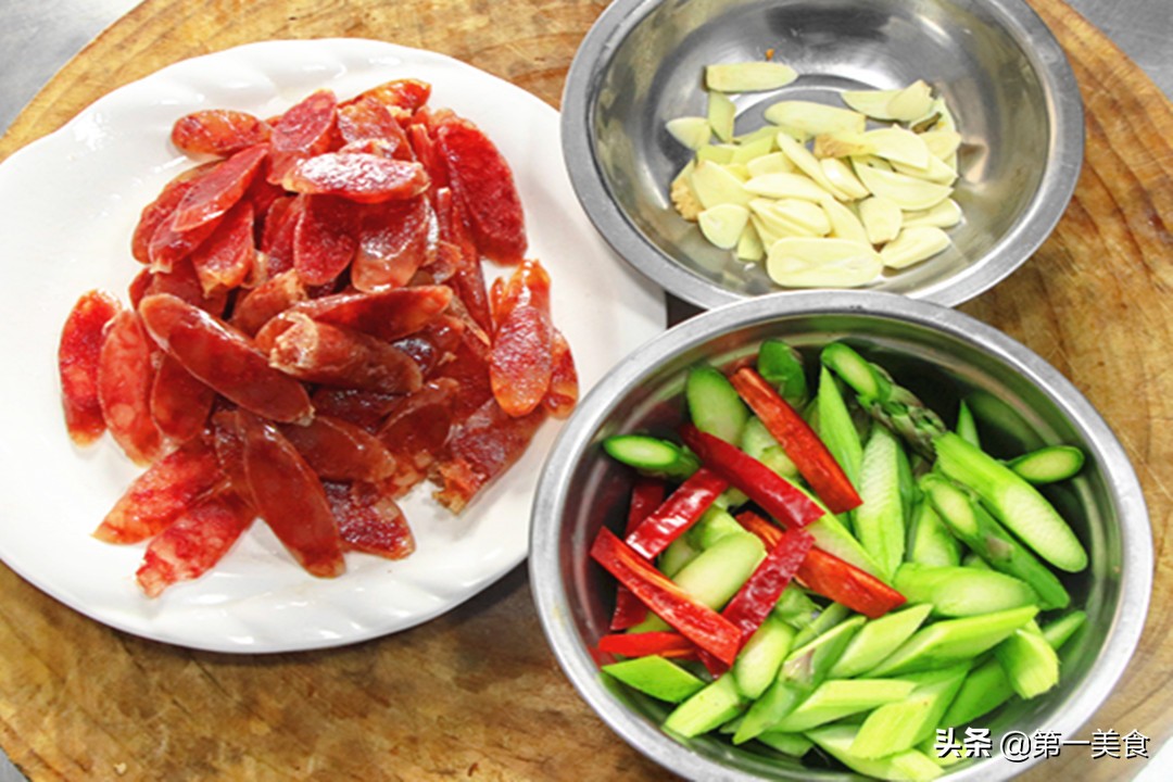 3.锅内烧水,加入少许植物油,植物油能保持芦笋鲜亮的色泽。水烧开以后放入芦笋焯水30秒左右,芦笋断生后捞出,用清水冲洗几下,这样芦笋的口感更加清脆。接着把腊肠倒入锅中,也焯水30秒钟倒出,用清水冲洗干净备用,焯过水的腊肠口感更软嫩。