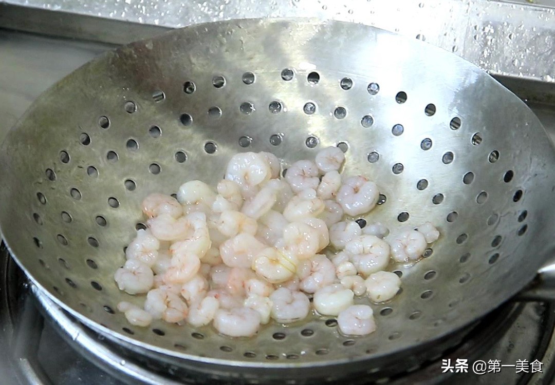 锅内再烧水,倒入虾仁,快速煮30秒钟,虾仁微微变红以后倒出来,用清水冲洗干净,控水备用,虾仁焯水的时间不要太长,否则鲜味会流失,口感会不够嫩。