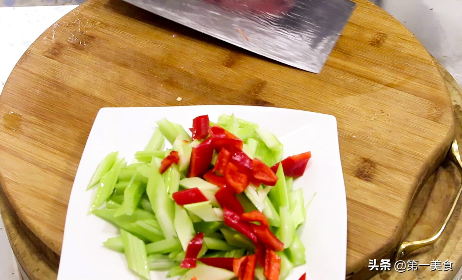 2.芹菜焯一下水,锅内加入适量清水,加入少许食盐和植物油,水烧开后,倒入切好的芹菜和红椒。焯水一分钟左右,芹菜断生后捞出,用清水冲洗冷却备用,清水冲洗能使芹菜口感更脆。