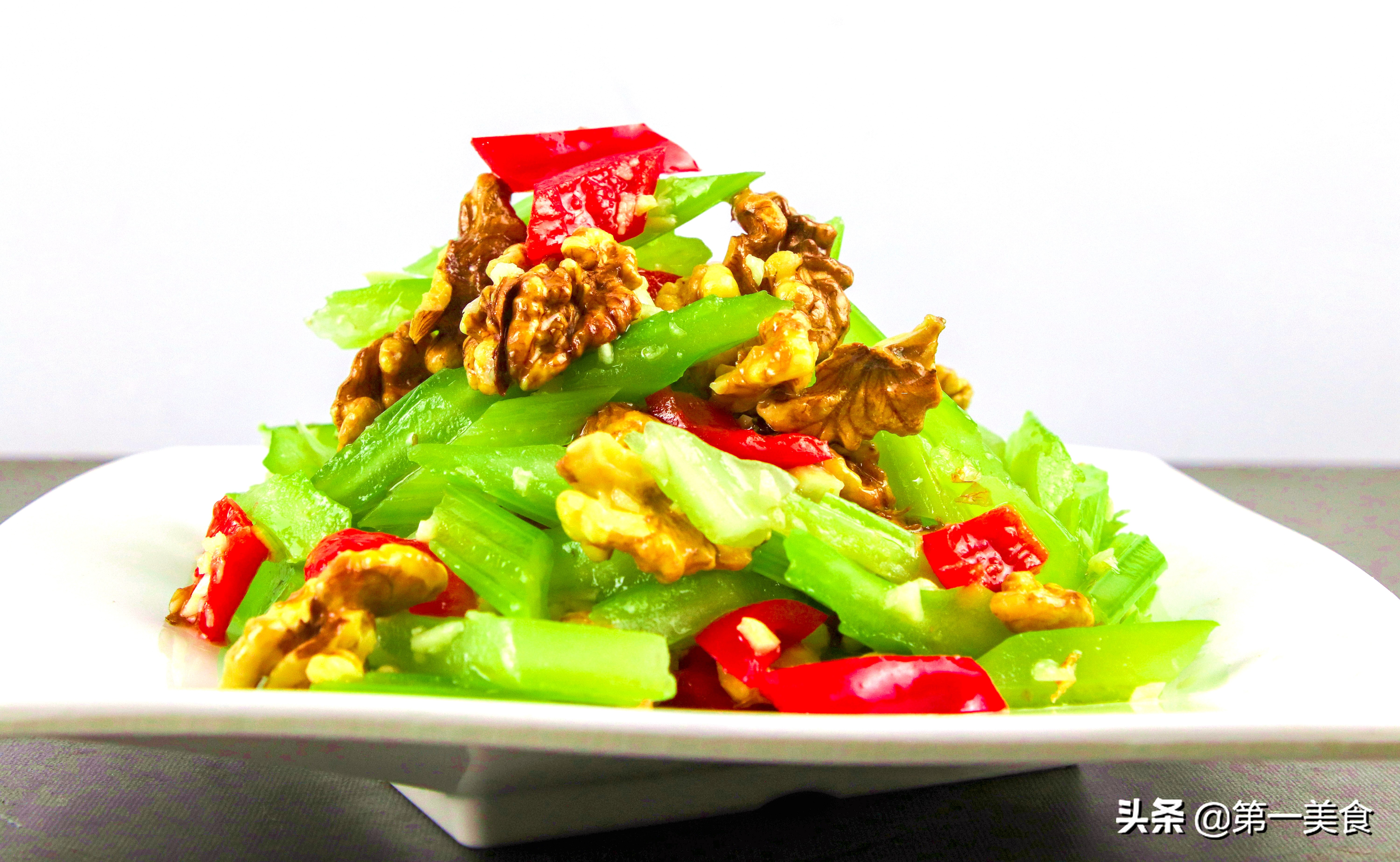 1.核桃200克,把核桃仁剥出备用,大蒜几粒,拍散后切成蒜末。西芹一棵掰散,扯去茎上的老筋,老筋影响口感,不易消化,放入清水中,清洗干净后捞出,斜刀切成菱形片备用。红椒半个,切成菱形片用来配色。