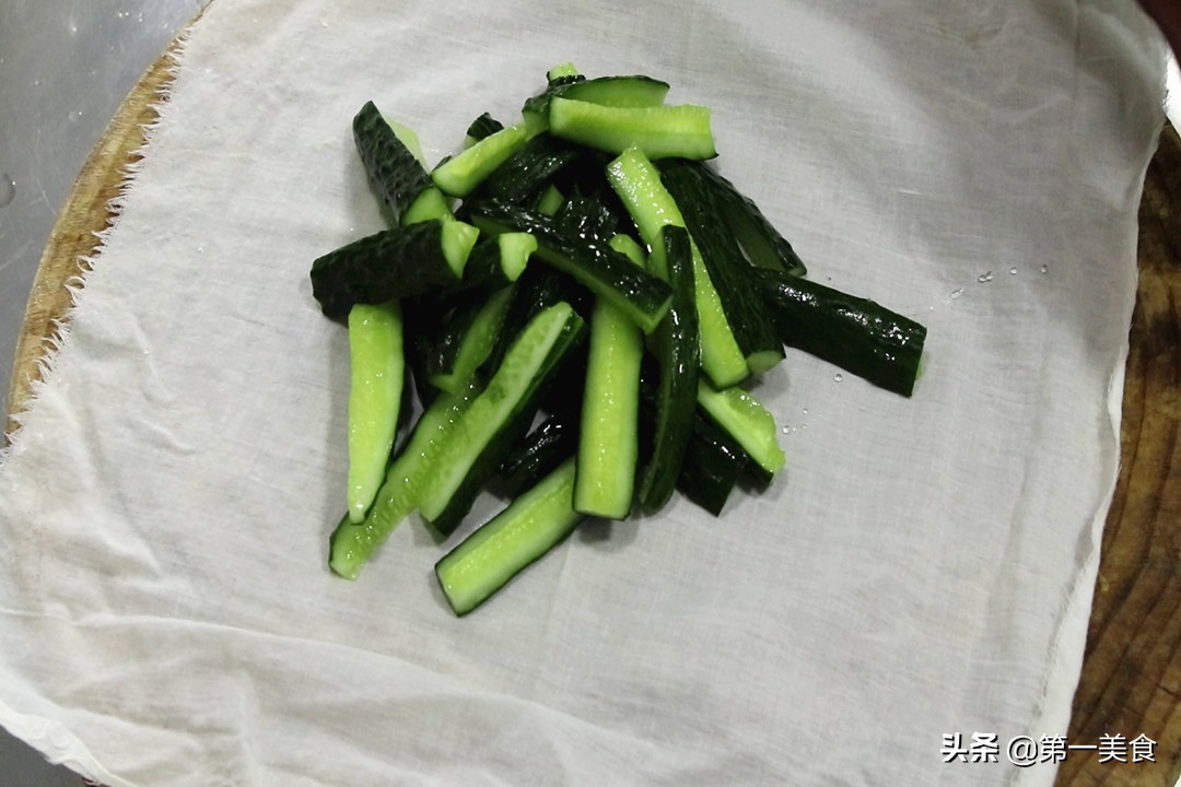 2.黄瓜腌好以后,倒掉里面的水分,加入清水多洗几遍。黄瓜放在纱布中,用力挤压出水,这一步的目的是挤净黄瓜中的水分,让黄瓜更容易吸收料汁入味,口感更脆。