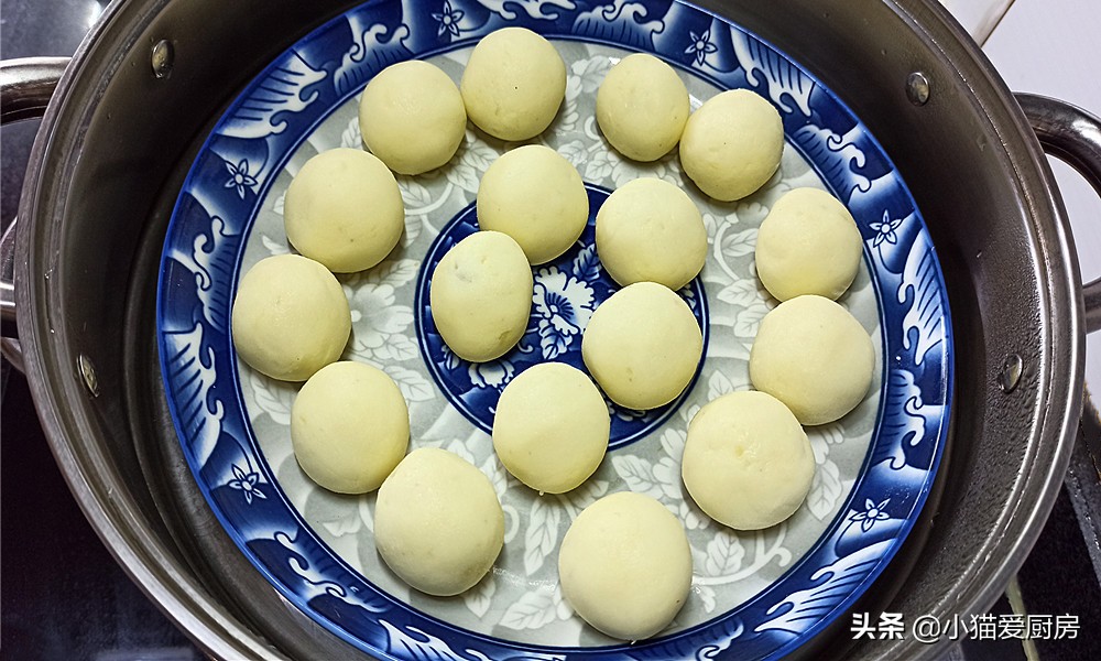 【步骤四】:然后用手把土豆泥揪成乒乓球大小的剂子,再用手搓成圆球装盘再次放入蒸锅中,用中火蒸15分钟。