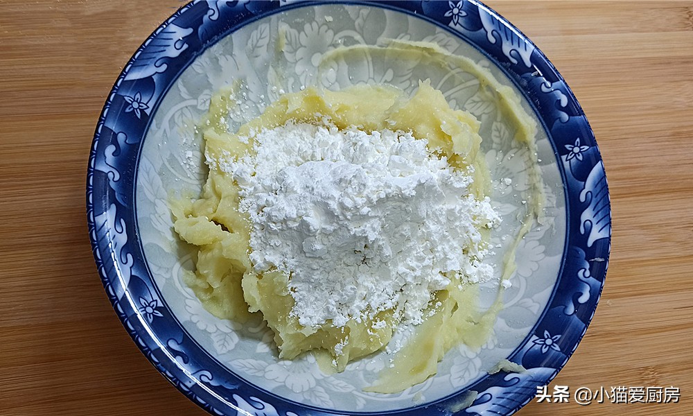 【步骤三】:土豆捣碎成泥后,依次放入少许盐和1勺胡椒粉,同时放入一大勺淀粉,搅拌均匀和成光滑的面团。