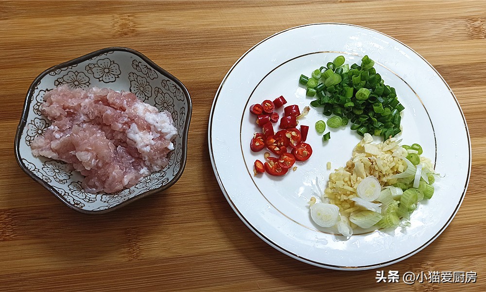 【步骤二】:把猪瘦肉简单切一下,然后剁成肉末、小米辣切成圈、生姜和大蒜都切成末、香葱切成末,然后分别装盘备用。