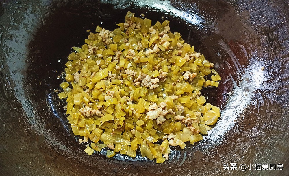 【步骤七】:肉粒炒熟,倒入酸菜把水汽炒出来。