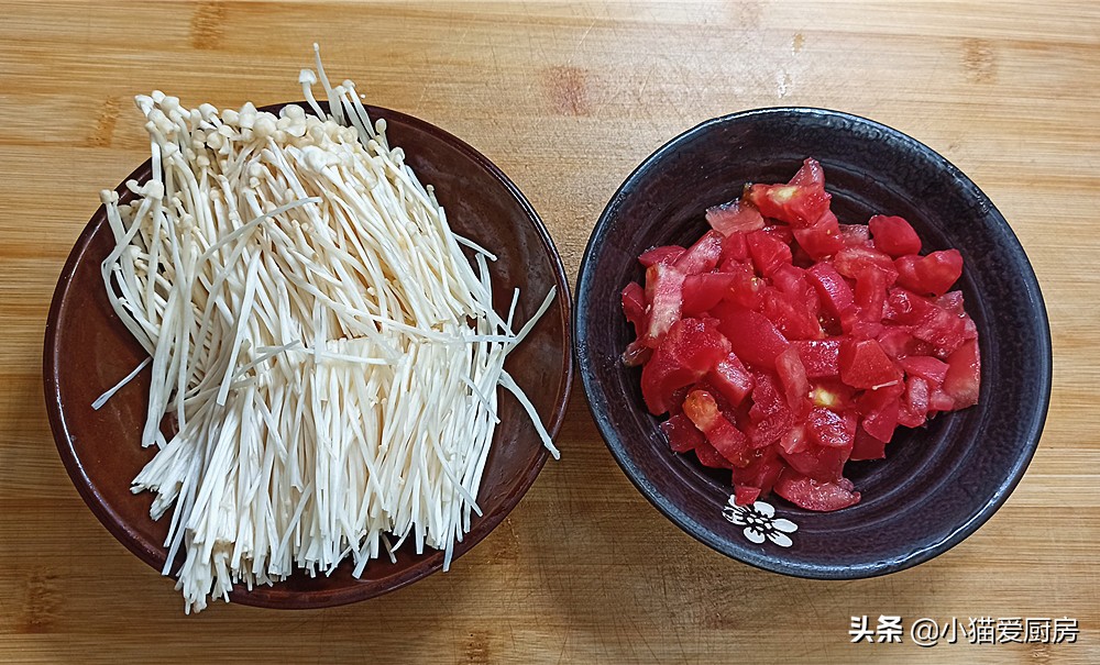 【步骤一】:把金针菇根切掉,清洗干净,然后用手分开切成两段装盘,西红柿去皮改刀切成丁装碗备用。