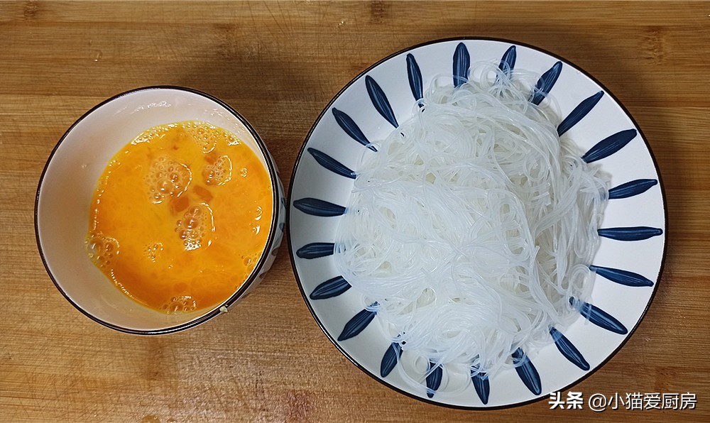 【步骤三】:把粉丝放入开水锅中煮1分钟,关火泡发,等粉丝泡发后,捞出来把水控干,鸡蛋倒入碗中用筷子打散成蛋液备用。
