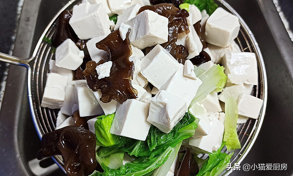 (3)豆腐、木耳、小白菜都要焯一下水,可以去除异味,但是焯水时间要掌握好,防止焯水过火。