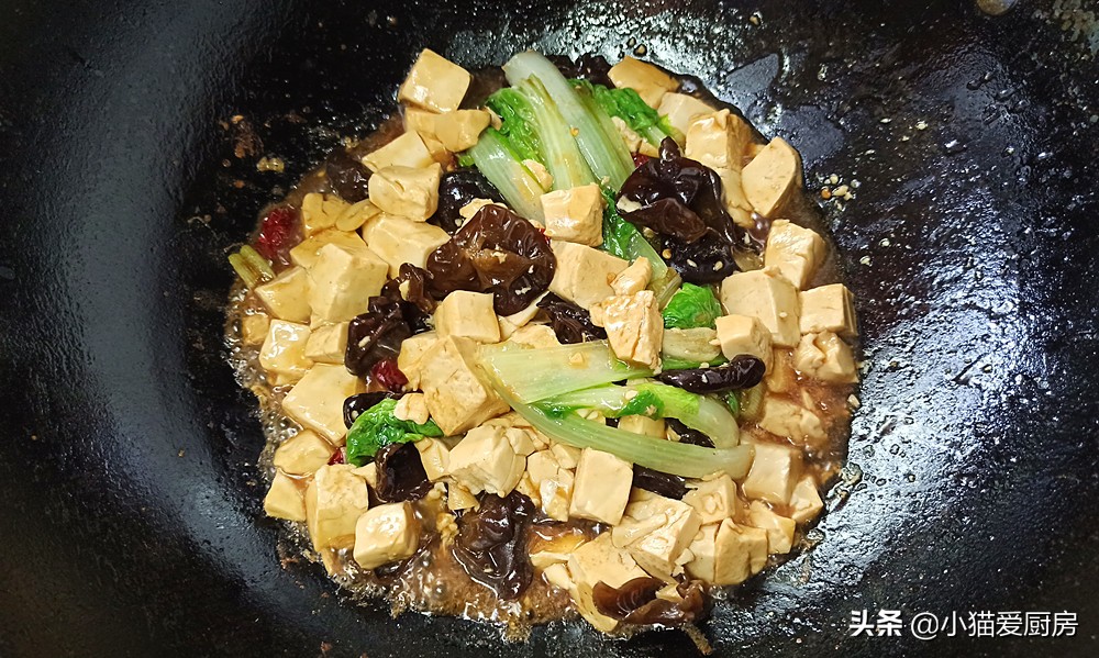 【步骤七】:豆腐、白菜、木耳翻炒均匀,放入准备好的调料汁,继续大火翻炒均匀,收浓汤汁出锅成菜。