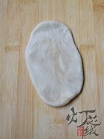 12、再将三折后的面团,擀成中间稍厚,四周薄的皮,有收口的那面朝肉,光滑面朝下,包入30g馅。