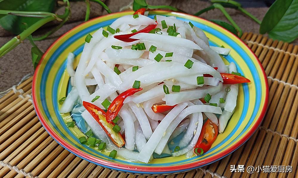 白萝卜的做法很多,我们平常都用白萝卜煲汤或者和肉烧来吃,而更多的时候却用它来制作泡菜或者咸菜来吃,经过腌制的萝卜,吃起来口感脆爽,味道有咸、甜、酸、辣等多种味道,今天做的是一道好吃的小菜, 就是用腌制的做法把白萝卜加上1碗糖醋汁,简单泡一泡就可以了,比一般的做法更简单方便,不用过夜就能吃,味道酸甜,想吃就能随手做,好了不多说了,下面介绍具体做法。