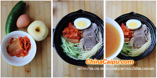 原料:冷面、牛肉、葱姜、大蒜、糖、盐、醋、生抽、冰块、鸡蛋、梨(苹果)、黄瓜、泡菜