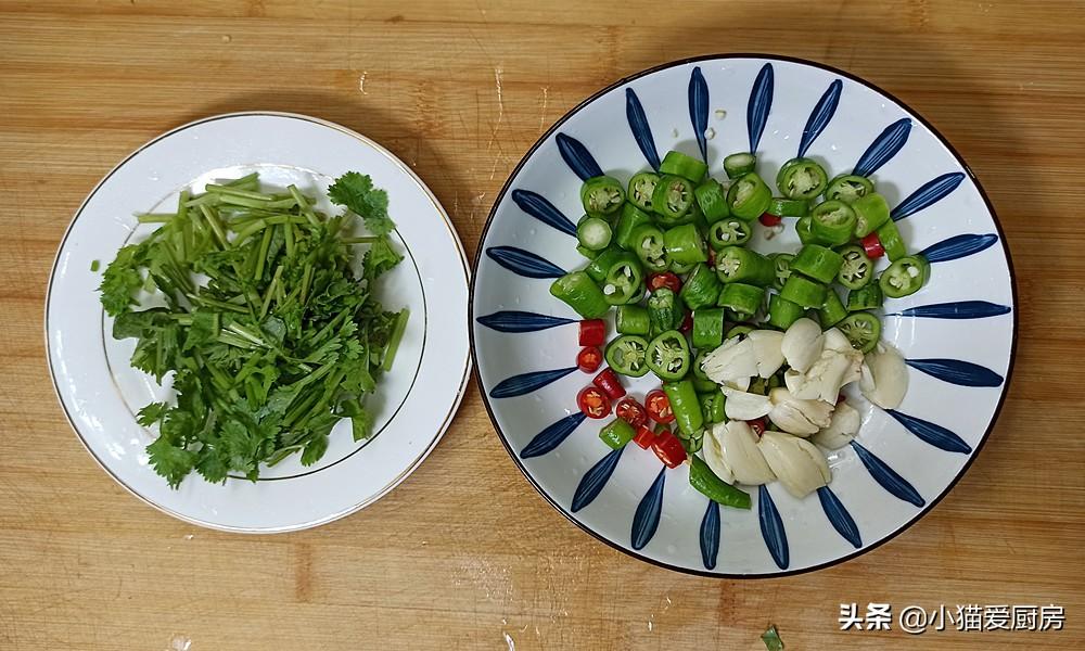 【步骤二】:尖椒清洗干净切成圈、大蒜拍碎、香菜切成寸段,然后分别装盘备用。