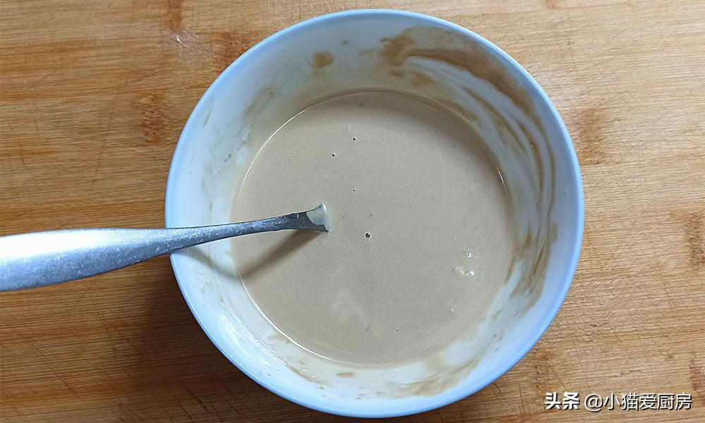 (3)泄芝麻酱要少量多次调入凉蒜水,这一步是调配芝麻酱最关键的一步,稍不留神就会出现“油水分离”。一般凉开水与芝麻酱的比例为1比1,凉开水下入时一定要“少量多次”,每次调入大约2小勺凉开水。 随着水量增多,本来凝固成块的芝麻酱又恢复了稀薄均匀的样子了。
