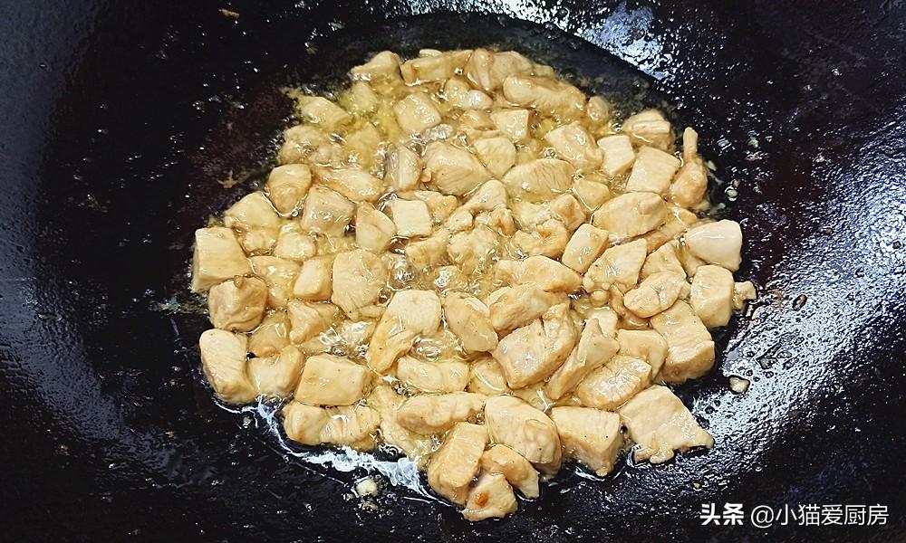 【步骤六】:重新起锅,热锅冷油,把腌好的鸡肉丁放进去,给它翻炒到鸡肉丁变色,然后盛出来把油沥一下备用。