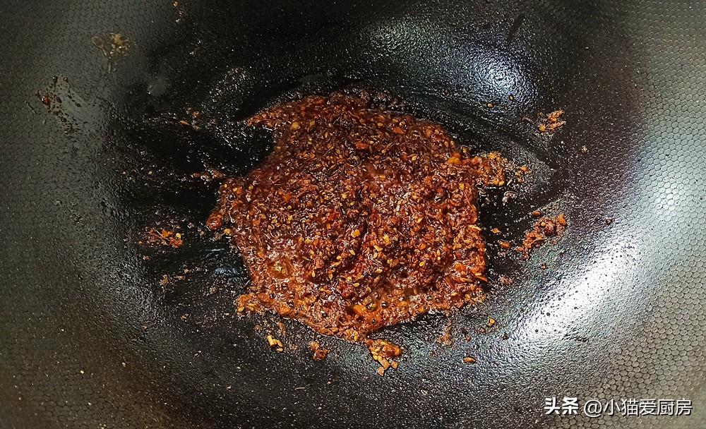 【步骤六】:调料炒出香味,放入辣酱和番茄酱炒出香味。