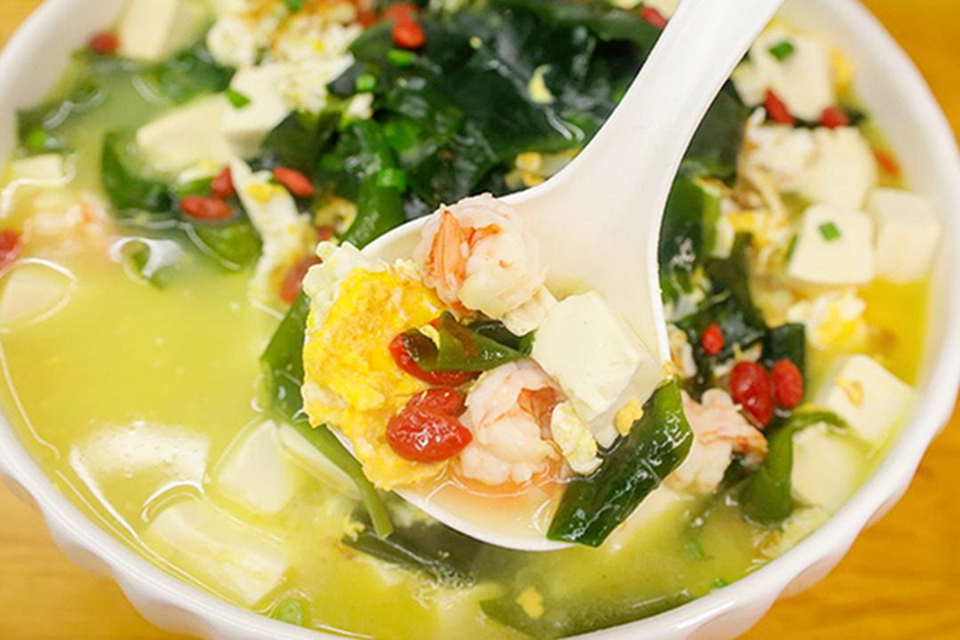 3.锅内烧油,把鸡蛋逐个打进去,中火煎成荷包蛋,然后用勺子打散,倒入半锅清水,放入海带、豆腐,加入食盐、胡椒粉调味,大火煮3分钟让食材的香味融合到一起,最后加点枸杞,即可盛出食用。