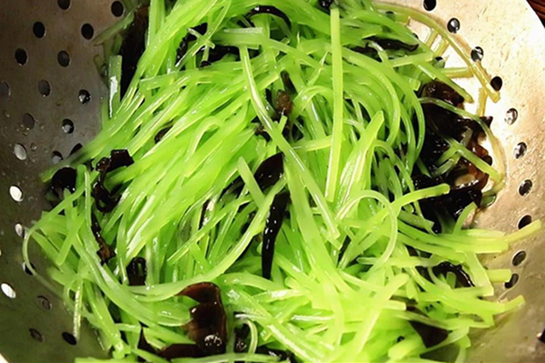 3.锅中加入适量的清水,放入少许食盐和植物油,大火烧开后倒入木耳、莴笋快速焯水30秒钟,莴笋断生以后倒出来,用清水冲洗过凉、控水备用。