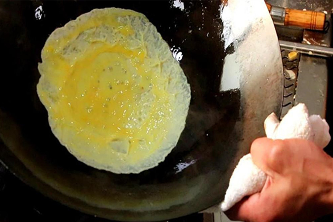 2.锅内烧油,充分滑锅以后倒出热油、加入凉油,倒入一半蛋液转动锅摊成圆形蛋饼,定型以后翻过来,把蛋饼煎至两面金黄倒出来,切成细丝备用。