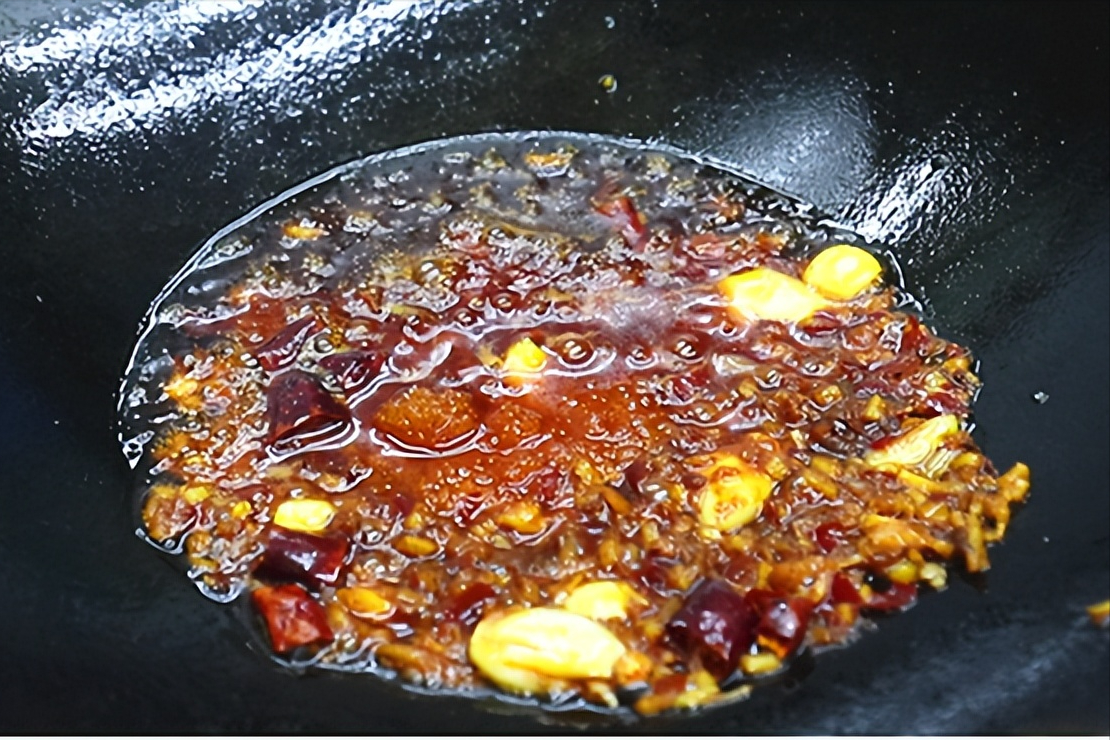 3.锅内烧油,挖一勺猪油增香,倒入姜蒜和干辣椒,开小火翻炒出香味,再加入两勺黄灯笼辣椒酱,两勺豆瓣酱,然后加入白糖、食盐、味精、十三香、胡椒粉,再淋入一些生抽,翻炒化开调料。