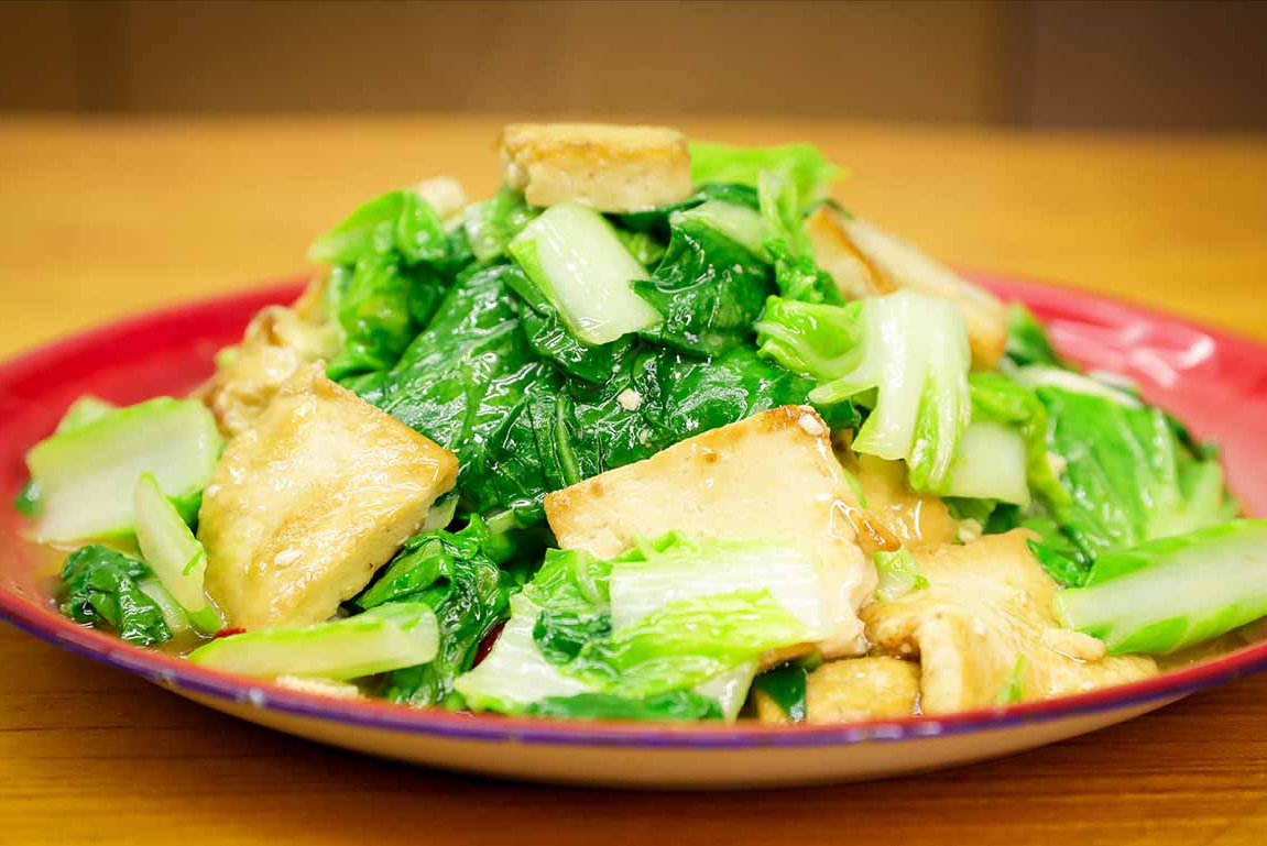 起锅烧油,放葱姜蒜片、干辣椒爆香,把小白菜倒进去,加入盐、鸡粉、少许糖提鲜大火翻炒至入味,倒入豆腐、勾点水淀粉,让料汁均匀裹到菜出锅。
