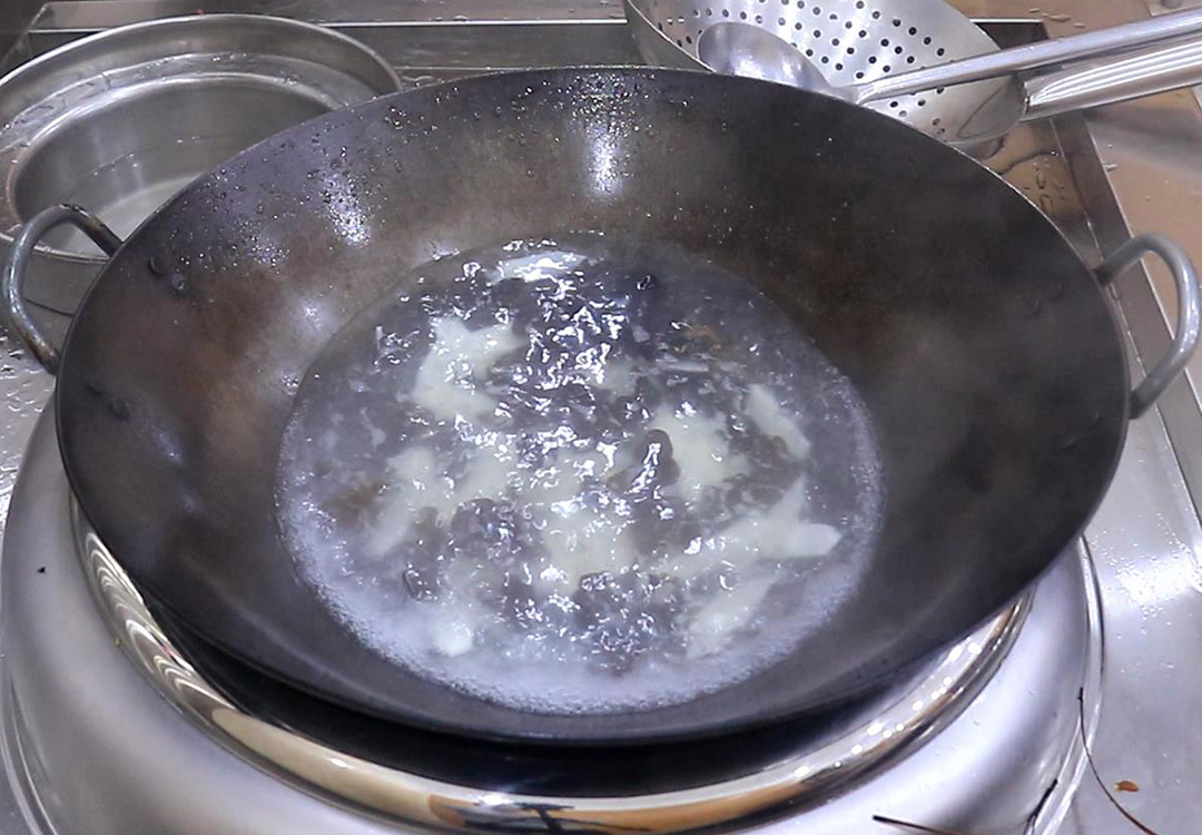 4.再次把锅烧热,加入刚刚炸好的葱油,把木耳、山药和红椒控干水分,油温五成热时,把配菜倒入锅中翻炒均匀,加入食盐2克,味精1克,转大火快速翻炒化开调料。
