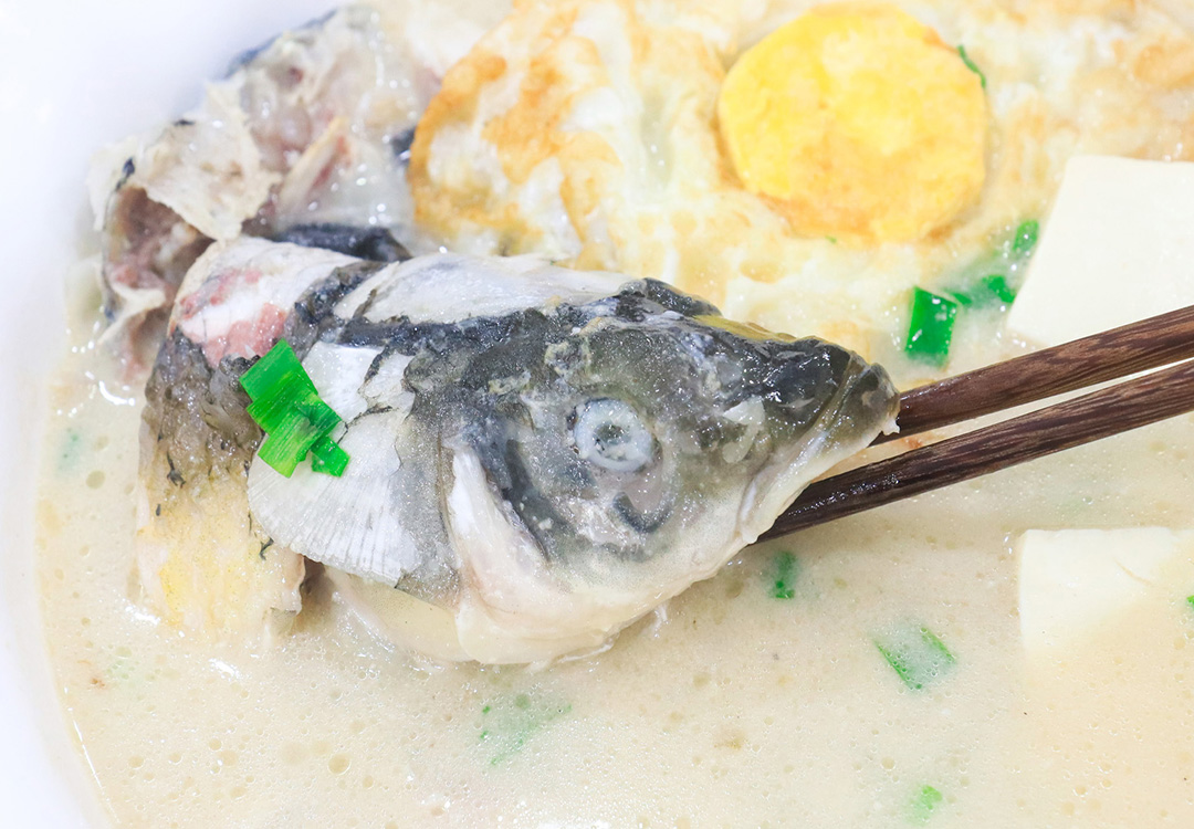 4.鱼头煎至两面金黄时倒入适量的开水,千万不要加凉水,容易使蛋白质凝固,不能充分炖出里面的胶原蛋白,放入煎好的鸡蛋,盖上锅盖,开大火炖煮10分钟,一定要开大火,这是鱼汤浓郁奶白的关键。