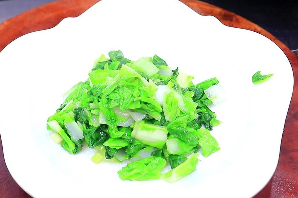 3.热锅凉油,放入葱花翻炒出香味,放入小白菜段翻炒一分钟左右,小白菜塌软以后,加入少许食盐翻炒均匀,盛放在盘中垫底。