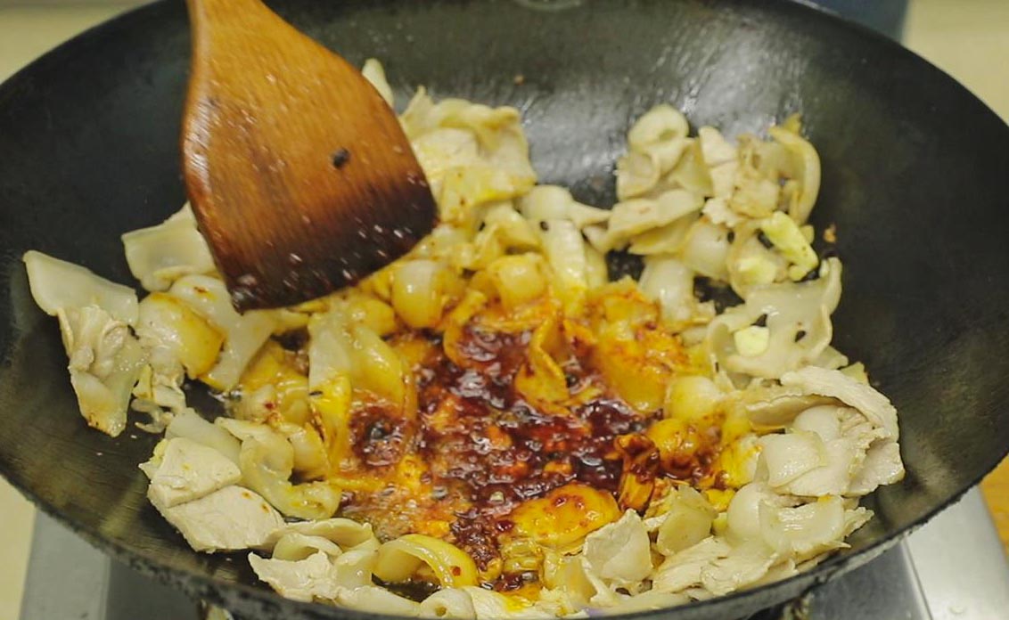 8、接着是刚才汆煮过的所有荤菜,多煮一会入味,淋上一点白酒,热气一激,煮个一两分钟就管出锅了。最后再烫毛肚,默数八个数立马出锅,再煮就不脆、嫩了。再舀几勺汤。