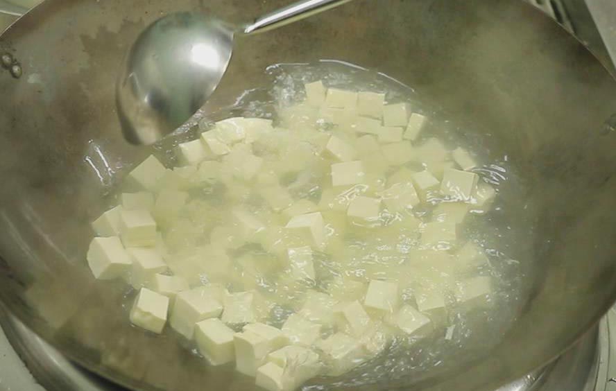 3、豆腐打焯用的是淡盐水,去腥入味,还不容易碎,一开锅就倒出来,再凉水冲一下,省类粘一块。