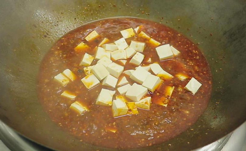 5、再往锅里加半勺刀口辣椒,加水,和豆腐持平的量,调味放鸡粉、胡椒、生抽、老抽,麻辣味熬出来才再放豆腐。