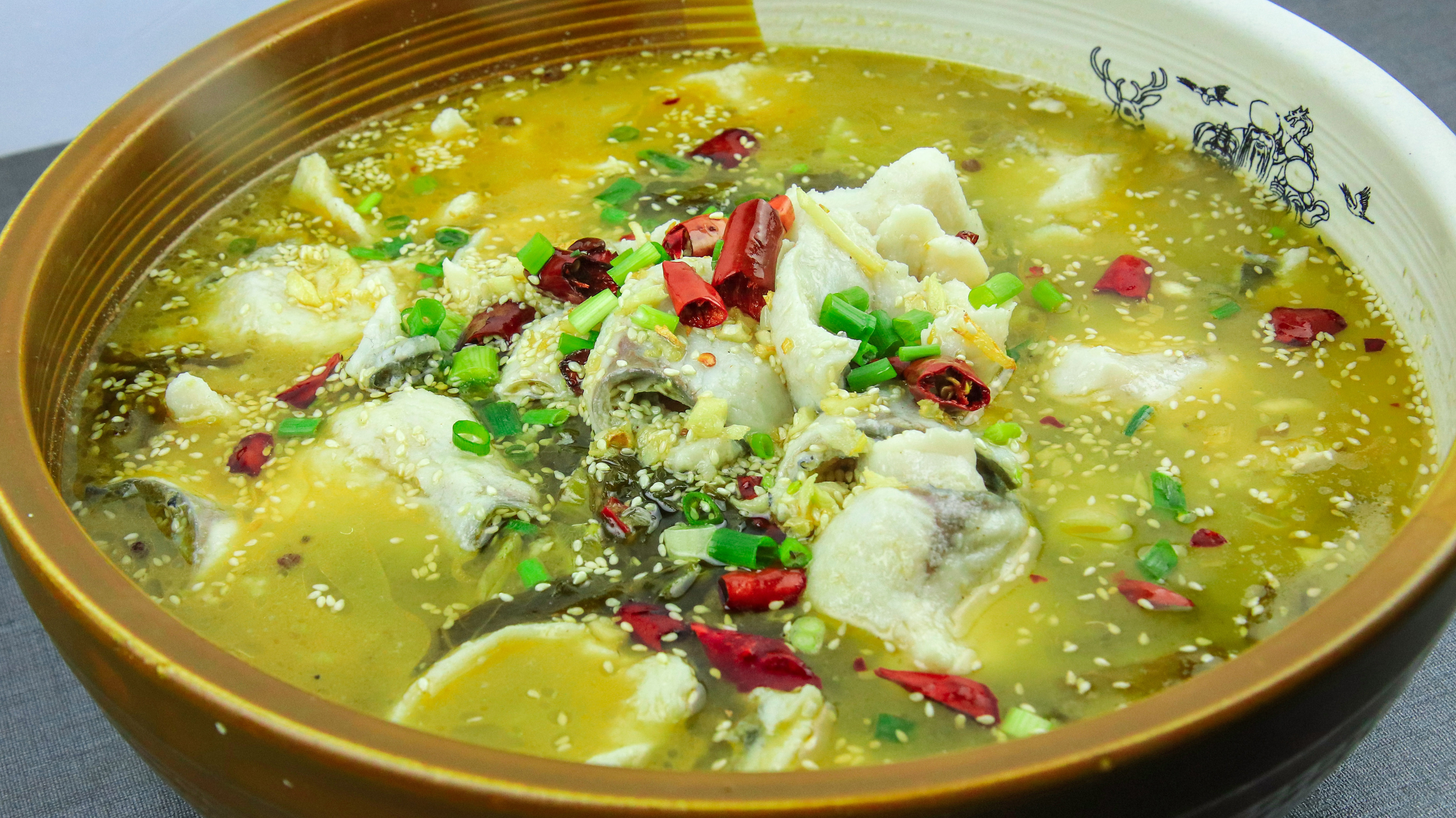 6、调味加入料酒、食盐、鸡精、白糖、胡椒粉,搅匀化开调料,不要煮的太久,两分钟以后把鱼骨和酸菜盛入盆中。起锅下入腌好的鱼片,开火煮20秒钟以后捞出鱼片,倒在盆中,接着大火把汤汁烧开,轻轻浇在鱼片上。