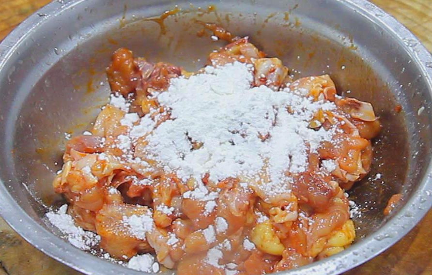 3、锅内烧油,油温五成热,把鸡块一块一块放入锅中,中火先炸2分钟,炸出鸡块中的水汽,常用勺子推动,把粘在一起的鸡块打散,鸡块炸香炸定型以后转为中大火,继续炸30秒钟,把鸡块炸焦酥、炸成金黄色倒出控油。