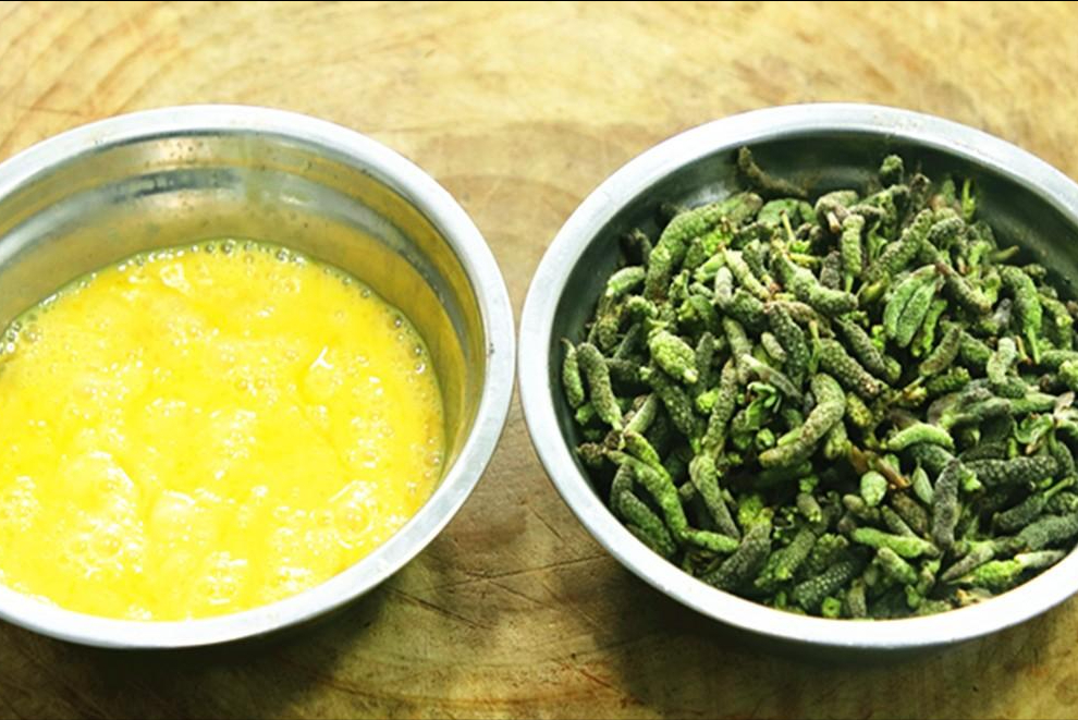 1.首先 我们准备现摘的褚不揪300克,清洗干净;盆中打入3个鸡蛋,加入食盐1克、鸡粉1克、胡椒粉1克,搅拌打散成蛋液。