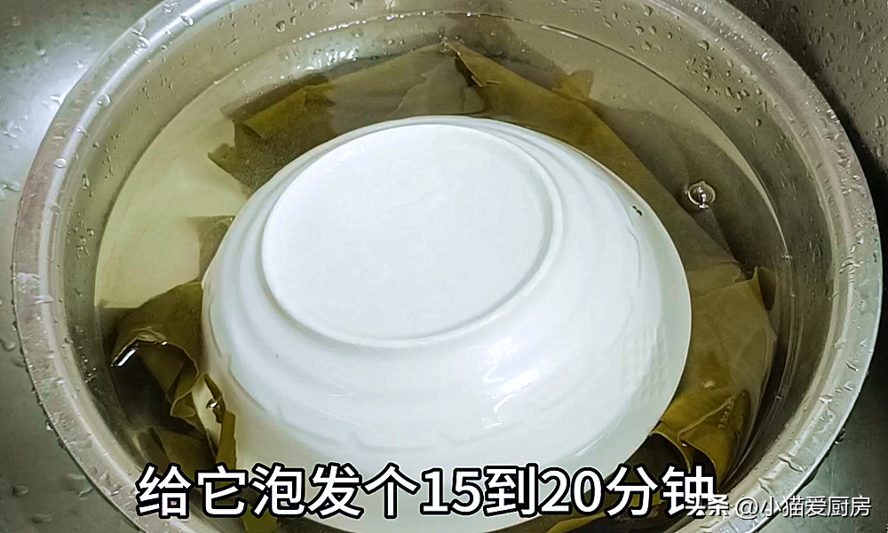 【步骤二】:海带蒸软后取出来,用清水把海带的沙子洗干净,放入温水,再放2勺白醋,用一个盘子压住,浸泡20分钟。