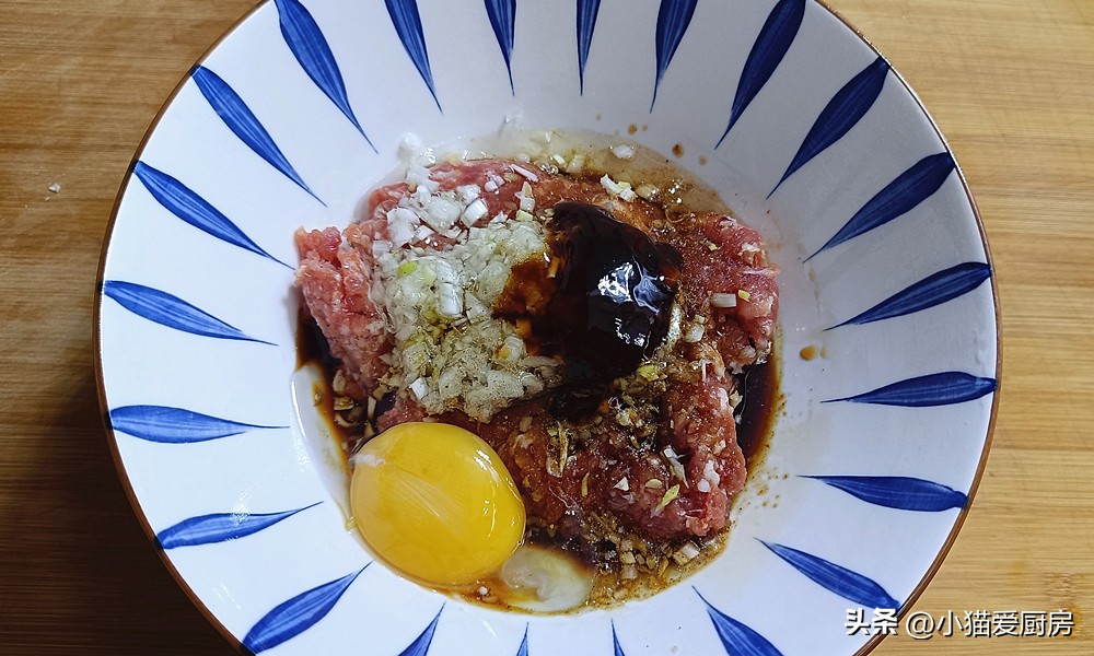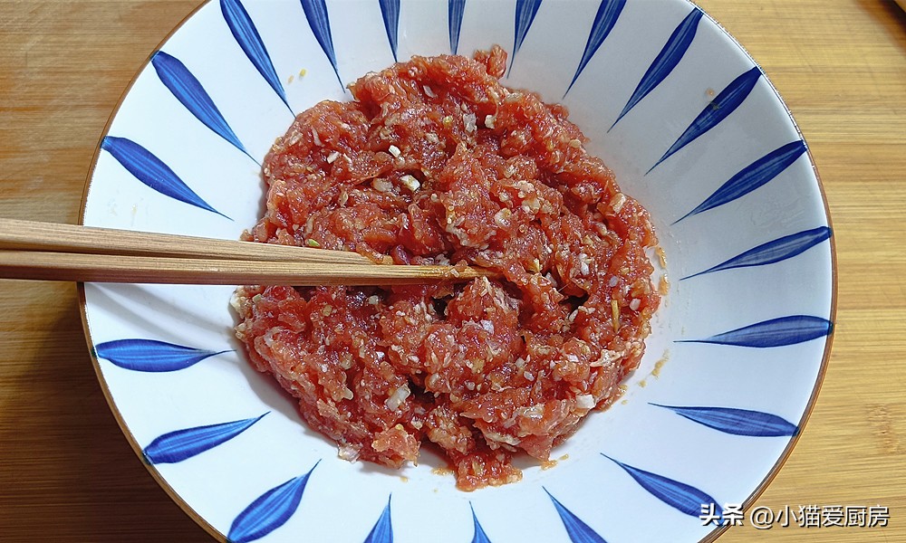 【步骤二】:然后用筷子搅拌均匀,让调料和肉馅充分融合,把肉馅搅拌上劲,腌制10分钟。