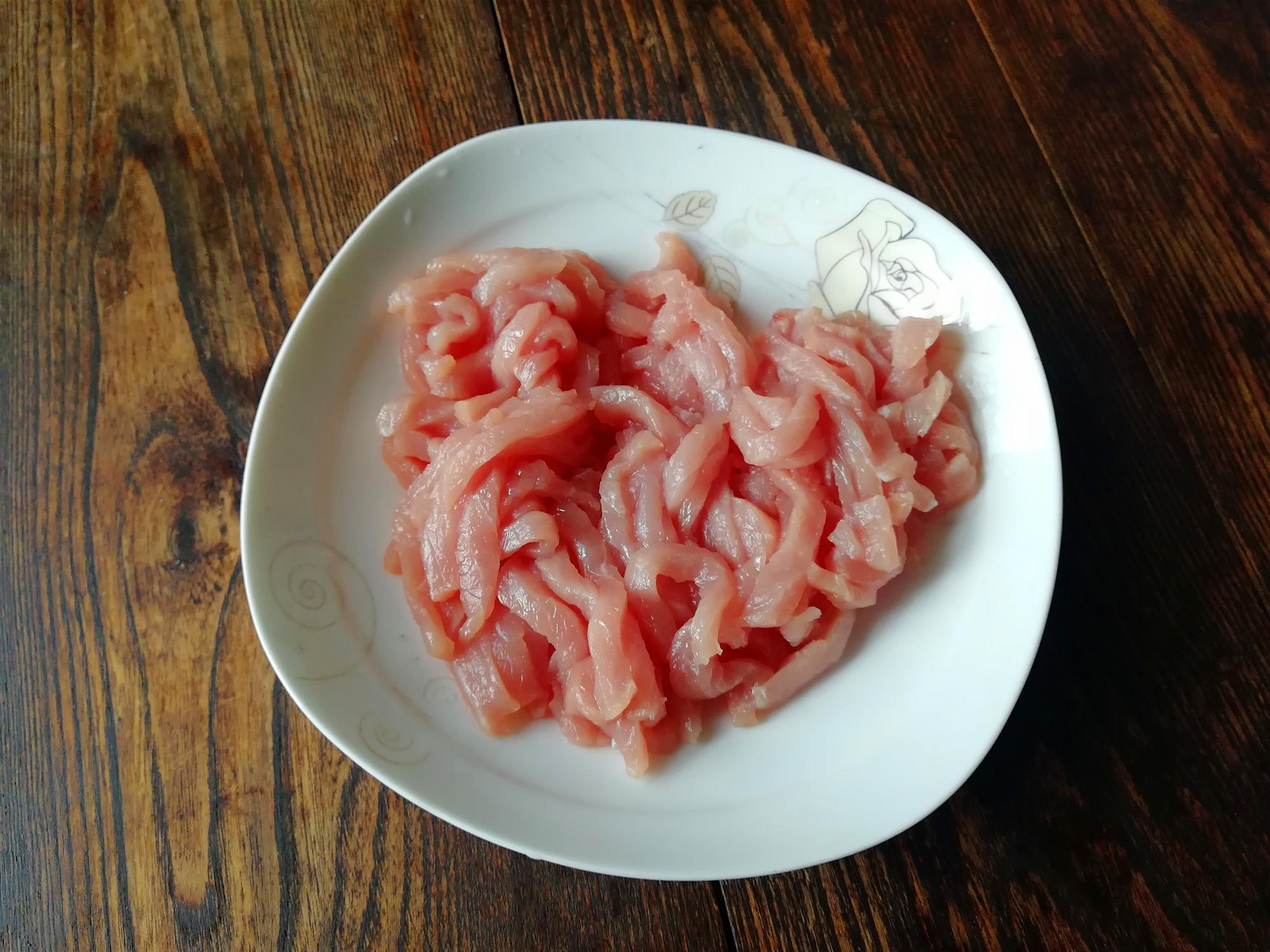 2、接下来,把猪肉洗净,去掉血水等杂质,切成肉丝,加入适量的酱油、料酒、淀粉、胡椒粉,腌制一下;