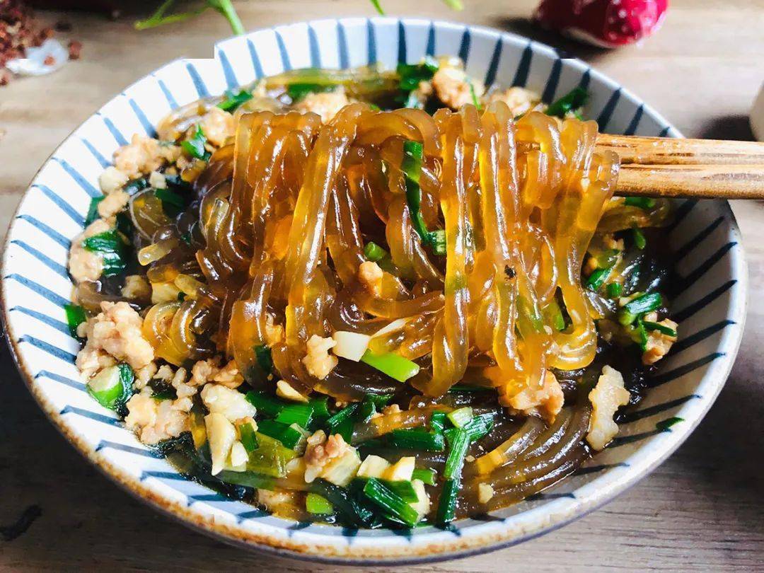 食材:韭菜、粉条、桃园建民西瓜酱、猪肉、葱姜、料酒、酱油、盐