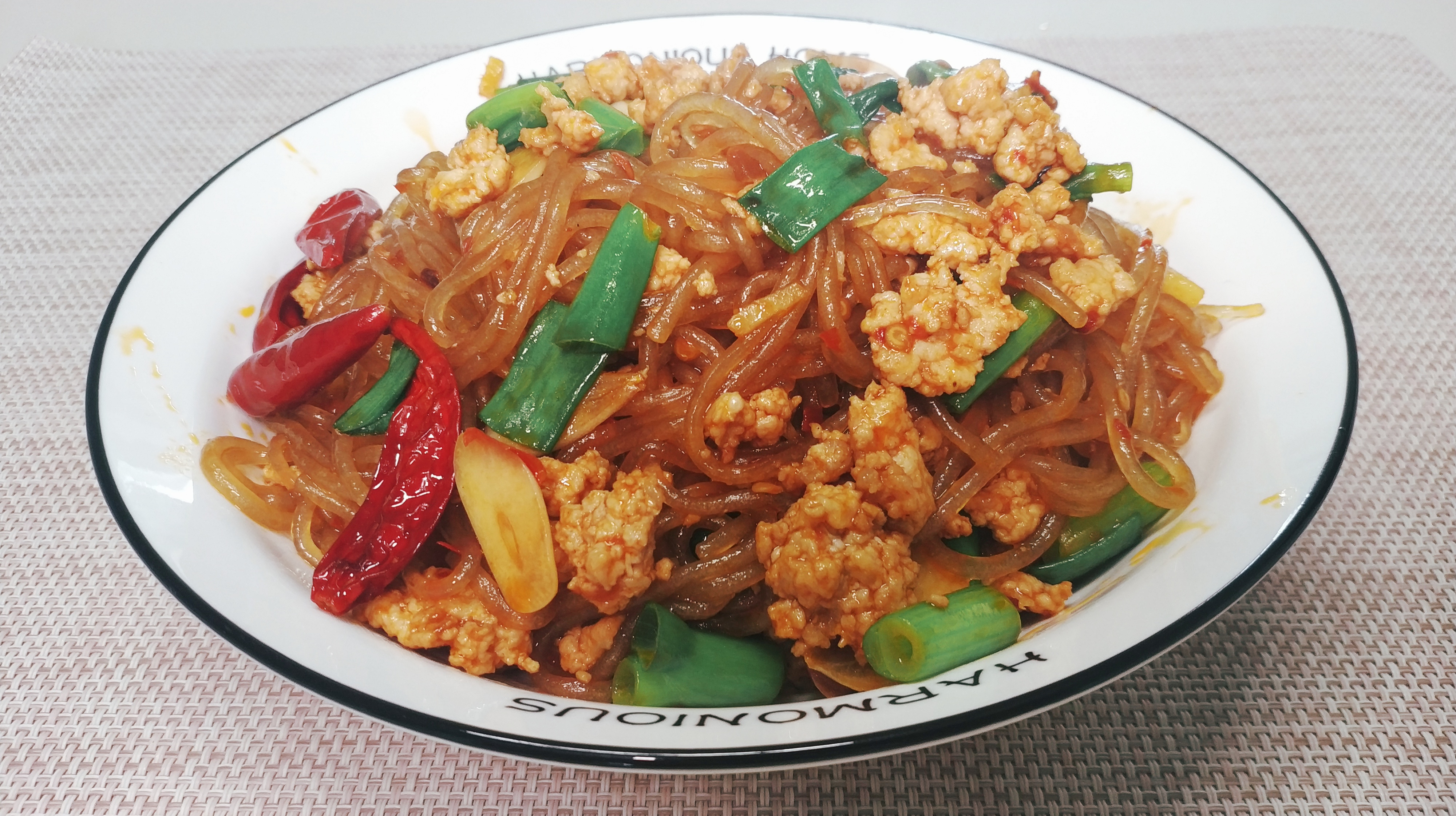 4、然后热锅烧油,放入葱姜炒香,放入腌制好的肉丝,滑炒到变色,放入粉条,加入一点桃园建民西瓜酱,翻炒均匀;