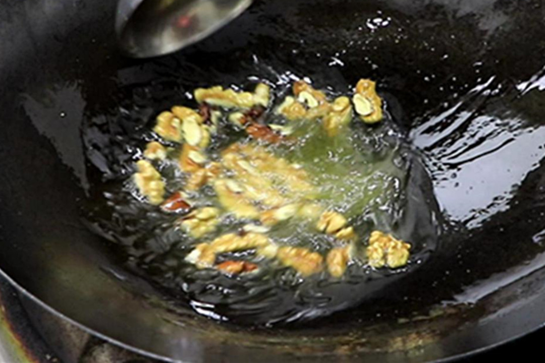 2.起锅烧油,油烧至四成热时倒入核桃仁,中小火炸一分钟,核桃仁焦酥以后倒出控油。