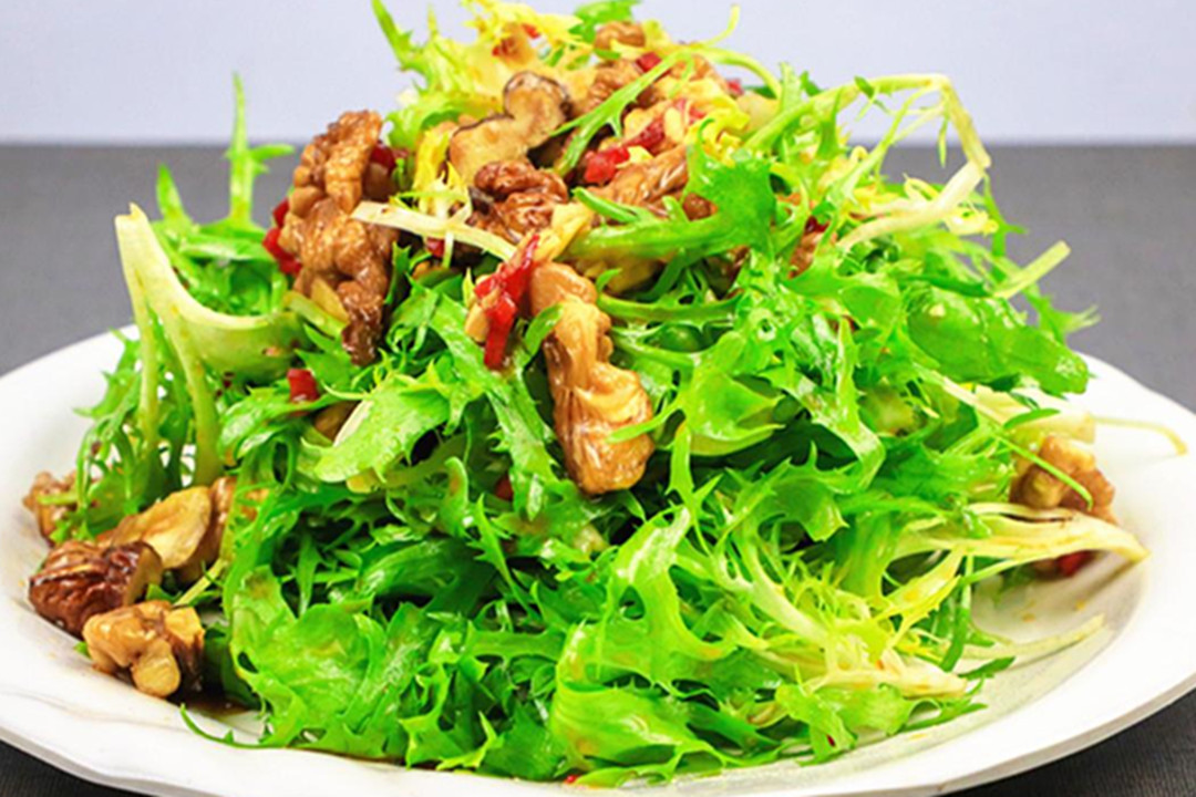 1.苦菊去根,放清水里淘干净;几个核桃、去壳只用核桃仁;红椒切成碎粒;大蒜切成蒜末备用。
