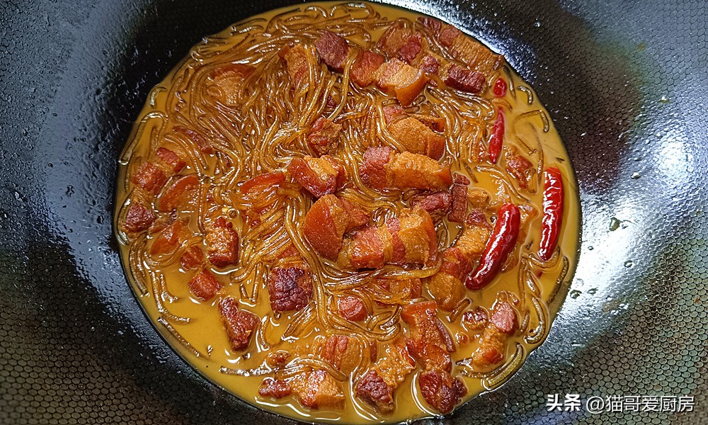 (6)粉条放一点老抽,让提前进入颜色,炖出的粉条,颜色好看,但是粉条要五花肉炖烂后放,基本上炖几分钟就可以了,不要把粉条炖得太烂,影响口感。