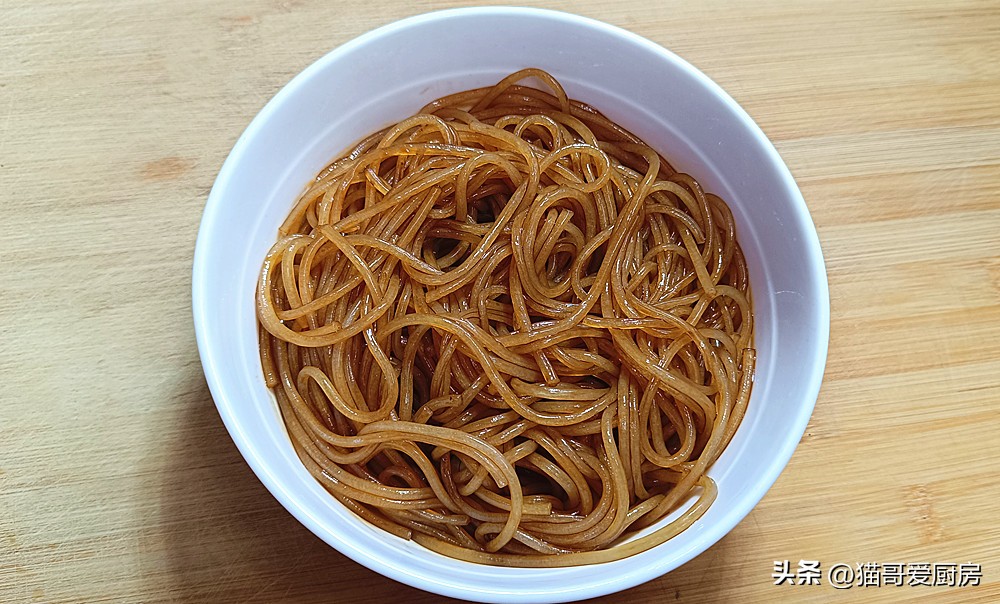 【步骤十】:把泡好的粉条捞出来控干水分,放入1小勺老抽,搅拌均匀备用。