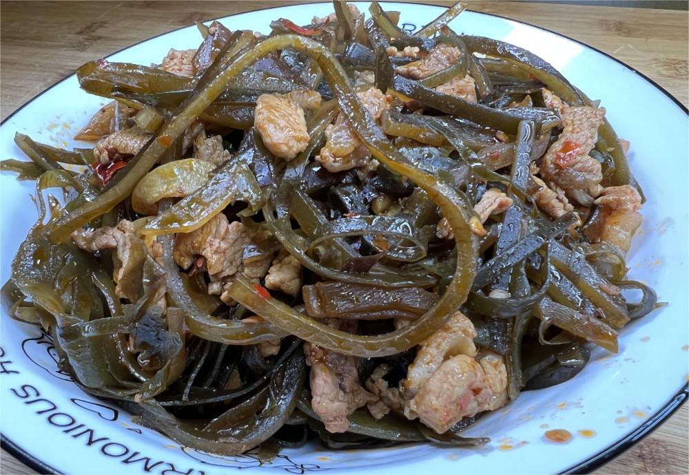 4、热锅烧油,放入葱姜蒜炒香,放入猪肉,煸炒一会儿,放入海带,加入适量的桃园建民西瓜酱和盐,继续翻炒到食材成熟入味,即可;