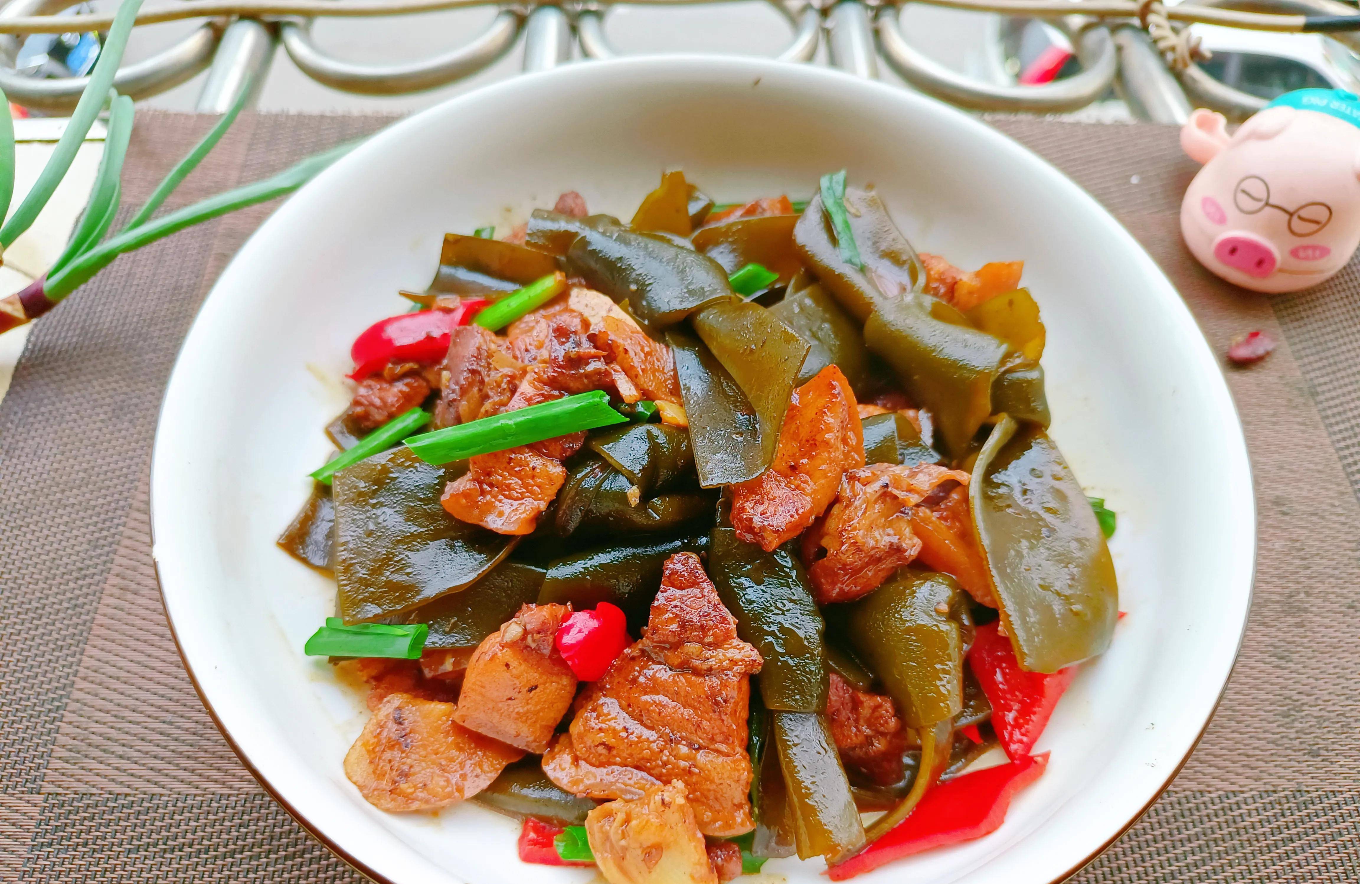 食材:海带、猪肉、桃园建民西瓜酱、葱姜蒜、料酒、蚝油、酱油、盐