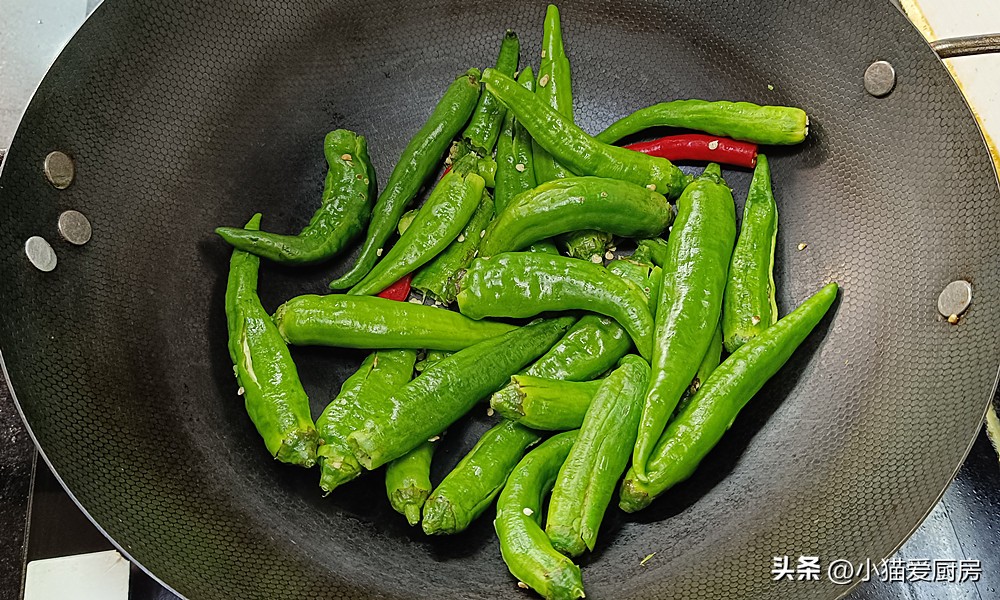 (3)煎辣椒要用铁锅,不要用不粘锅或者玻璃等器具来煎,高温容易把它们烧坏。辣椒下锅煎的时候不要放油,放油的话就不容易形成虎皮疙瘩。