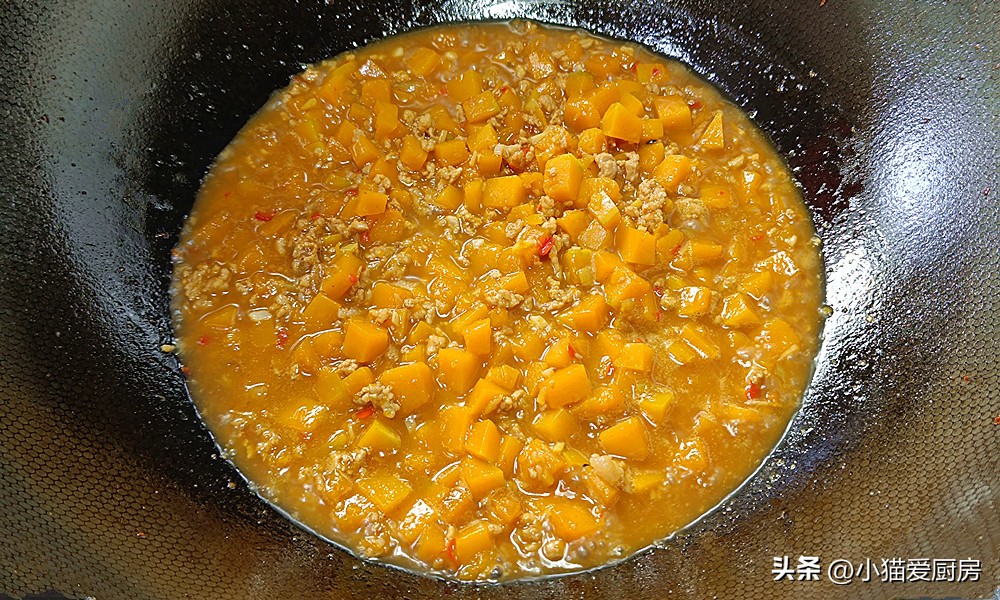 【步骤五】:肉末炒出酱香味道后,倒入南瓜块,翻炒均匀。