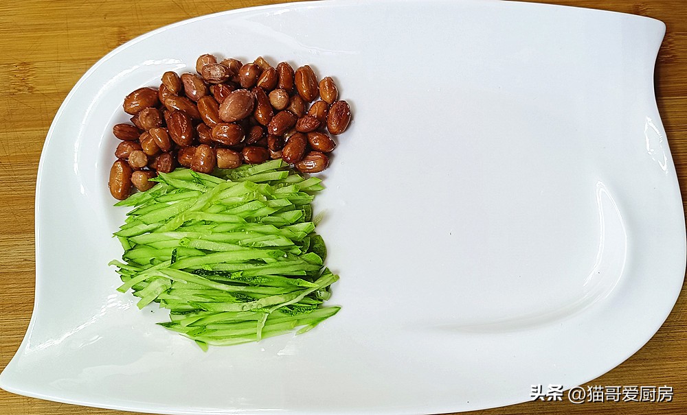 【步骤一】:把黄瓜清洗干净分别切成摆盘,同时放入准备好的熟花生米备用。
