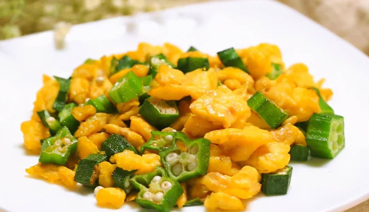 3、 然后热锅烧油,放入葱花炒香,倒入搅拌好的鸡蛋液,翻炒成块,放入秋葵,加入适量的盐,继续炒到食材成熟入味,即可;