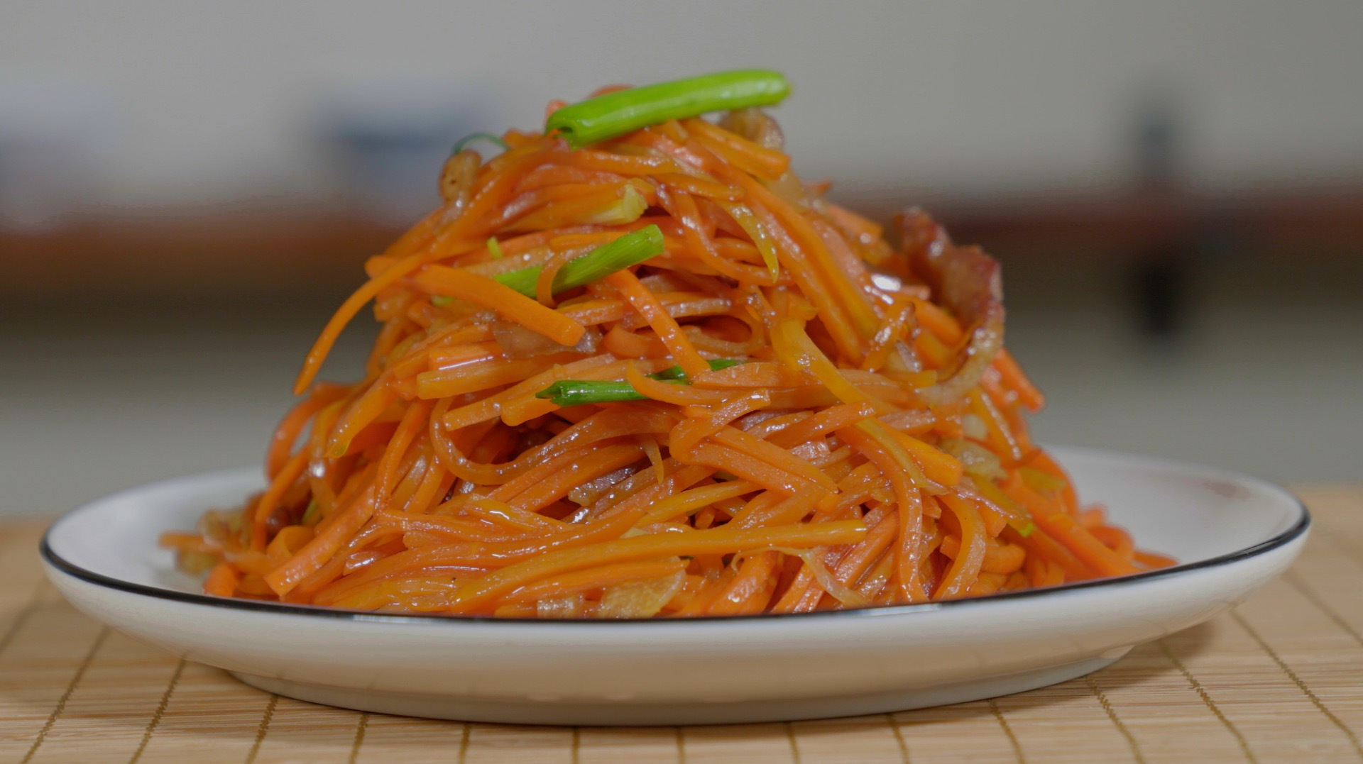 做法:1、先把胡萝卜仔细冲洗干净,去掉外皮等杂质,切成胡萝卜丝;